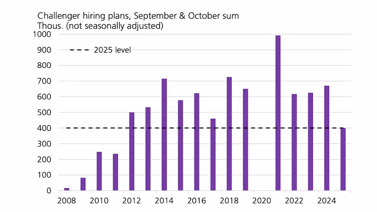 UBS cited multiple indicators now running above pre-pandemic levels: unemployment insurance claims, WARN notices and corporate layoff announcements. October alone saw 157,000 job cuts, according to Challenger, Gray & Christmas — the highest since July 2020. Through October, U.S. companies announced roughly 760,000 layoffs, exceeding every year since 2009. Major names like Amazon, UPS and Target have slashed tens of thousands of jobs.